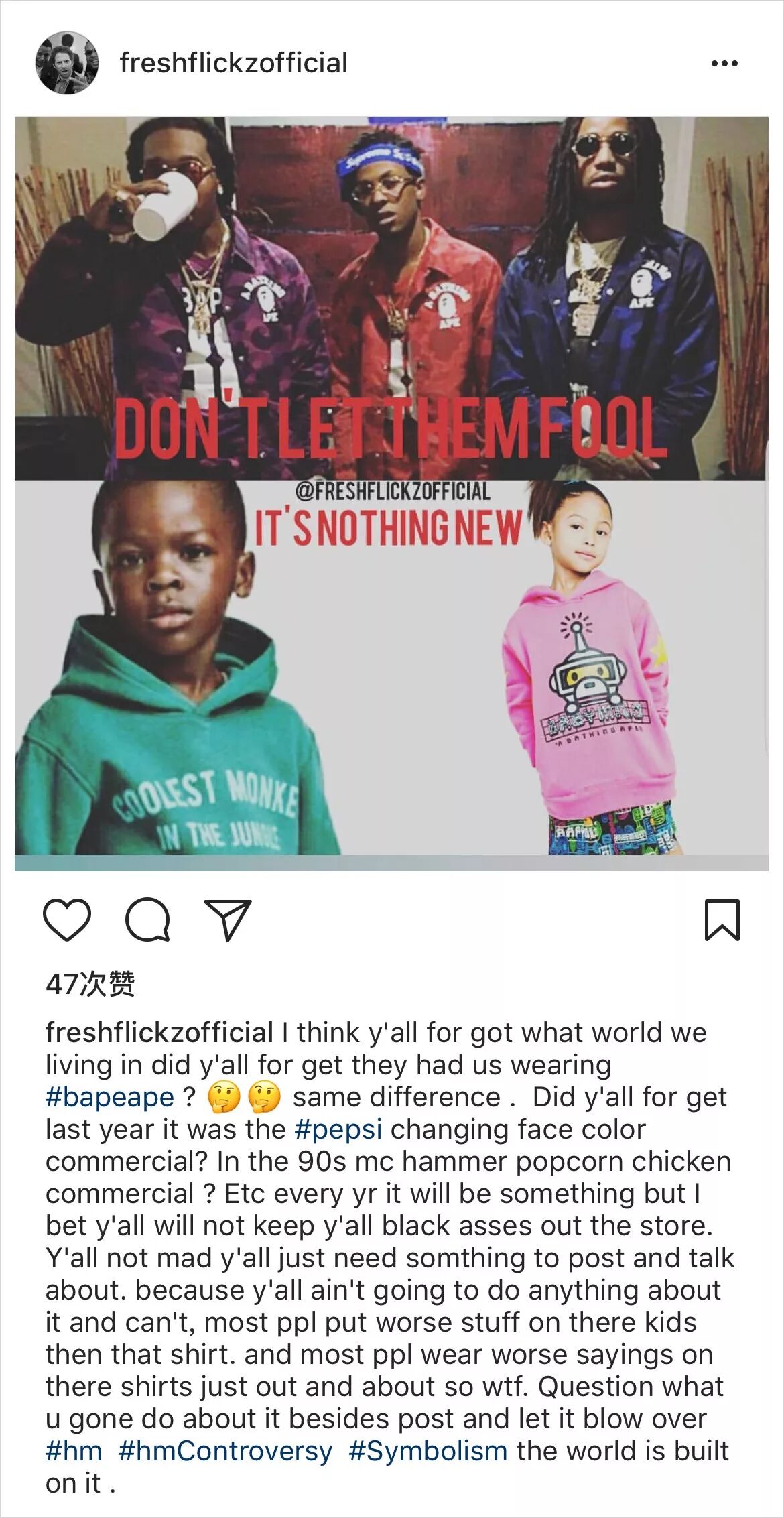不过在笔者看来,A BATHING APE® 的性质和 H&M 根本不能拿到一起比较,虽然 A BATHING APE® 同样是以“猿人”或是“猴子”作为品牌的标志性设计语言,但出发点完全是不同的。至于 H&M,我们虽然无法断定它究竟是无心之作还是真的故意为之,但事情闹到这样的结果,也多少有点作茧自缚的感觉,并不值得人们同情,而且,这可不是这个快时尚品牌第一次遇到这样的麻烦了…