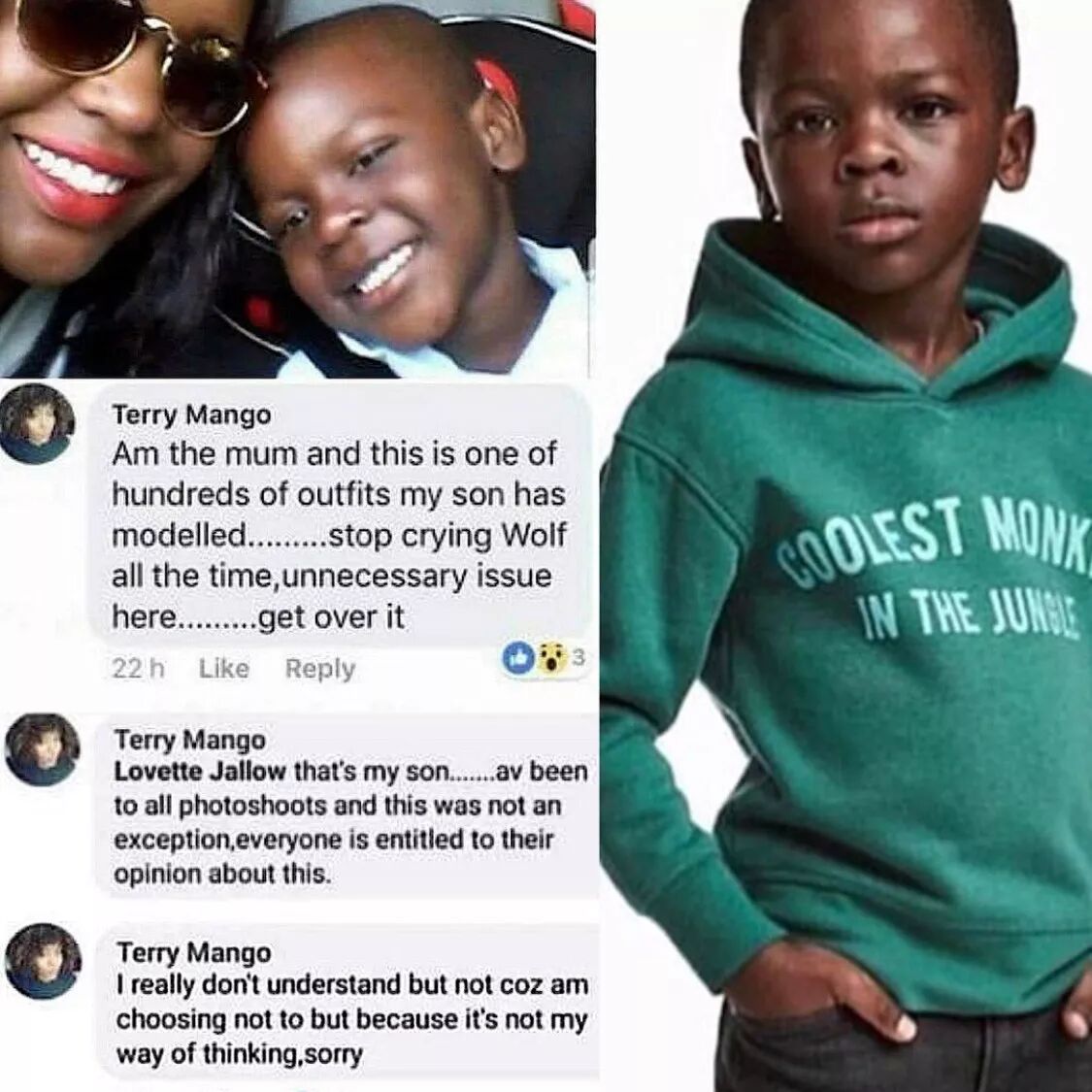 与网络上的大部分观点不同,妈妈 Terry Mango 表示,实际上她的儿子在这次的广告拍摄中试了上百件服装,这件引起众怒的帽衫只是其中之一,而且并不是只穿了这一件,所以这位母亲觉得,尽管每个人都有自己的看法,但没必要把这事儿上纲上线。的确,就连当事人的母亲都认为这事没那么“严重”,自然网上也一定有不少声音是站在“抗议”的对立面上的,举个例子: