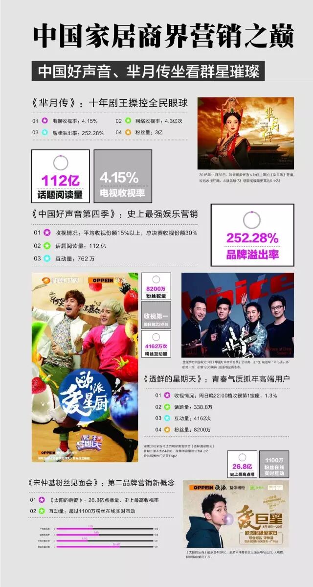 据悉,2016年的爱家计划强势贯穿欧派全年大型促销活动,推广费用高达惊人的6亿,所赞助和合作的节目均是《芈月传》、湖南卫视《透鲜滴星期天》和宋仲基粉丝见面会等最火最热的影视和综艺节目,品牌影响力在强力IP的助推下再攀巅峰,堪称史上最强品牌营销!