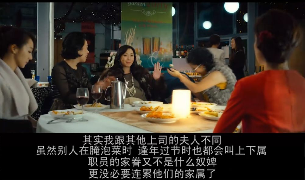 参加丈夫公司的聚会,上司夫人故作姿态的拒绝了下属家属如女王般的侍奉和摇尾乞怜的讨好,可见平时没少这样享受,但依然道貌岸然,说着冠冕堂皇的话。