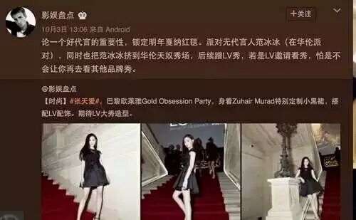 精明的LV将巩俐和范冰冰安排在了一起,不意外的比一身黑的巩皇更抢眼,也更有中国味儿