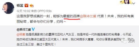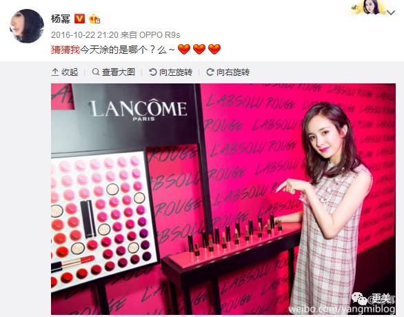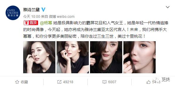 然而这次可不一样了,不是所长崇洋媚外哈~揽下雅诗兰黛的代言,大幂幂可以说是直接从国产品牌跃升到国际大牌,从中国红到了国外的节奏啊~要不然前几个月还天天涂兰蔻唇膏,在微博上问粉丝涂哪个色号的大幂幂