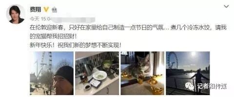 2月4日,大年三十下午,不擅长分享日常生活点滴的费翔,突然更新了自己的微博,称自己目前人在英国伦敦迎新春,并且po出了4张照片。迟迟未结婚的费翔为了给家里增添一些年味,一些节日的气氛,只得独自去买一盒速冻水饺回家煮着吃,听上去稍显落寞。