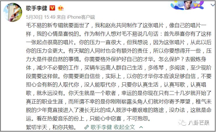 当李健的学生,一定是非常美妙的体验。之前他给毛不易制作专辑,完了在微博发了一大段感想,字字都出自肺腑,我不是毛不易但仿佛也能从中得到启示: