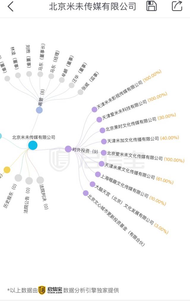 作为一家以内容制作起家的传媒公司,其主打业务也由纯内容制作衍生到投资布局,目前米未已经投资了三家专业的内容制作团队果时传媒、米加传媒和一家影视IP孵化团队大脑天宫。