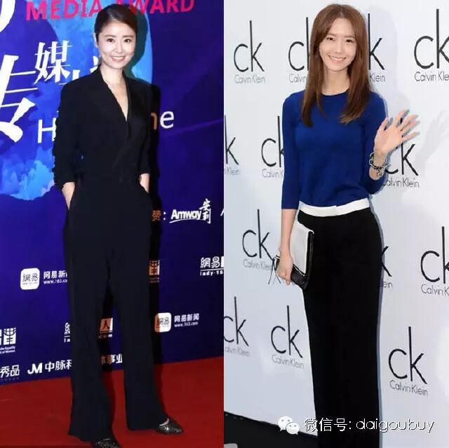 阔腿裤今年很流行,林心如选择这套黑色连体裤超时髦干练的,深V设计还很性感,允儿穿深蓝色针织衫搭黑色阔腿裤,多了一抹亮色,很吸睛。