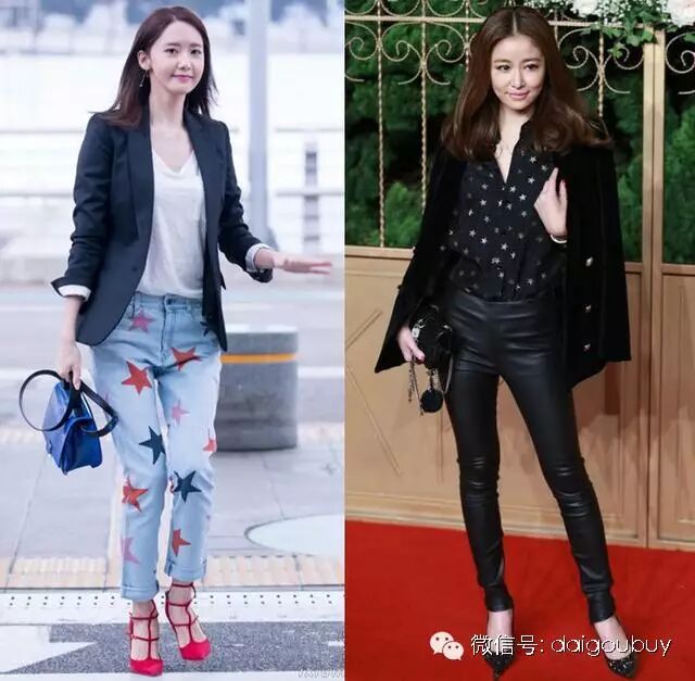 同样是穿西装,允儿选择搭休闲的T恤和牛仔裤,混搭红色高跟鞋,多了一丝女人味,但是林心如一点也不差哦,披肩西装搭印花衬衫,下搭皮裤和尖头高跟鞋,显得干练又不缺乏女人味。