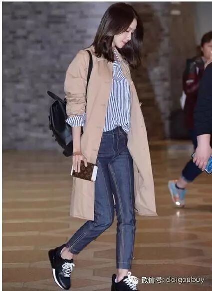 私服街拍允儿特别爱穿牛仔裤,搭浅军绿色双排扣短外套,脚踩运动休闲鞋,简约又帅气。
