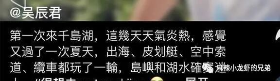10月3号,吴辰君于视频账号上分享了一段外出游玩的画面,并留言说道:第一次来千岛湖,这几天天气炎热,感觉又过了一次夏天,出海、皮划艇、空中索道、缆车都玩了一轮……