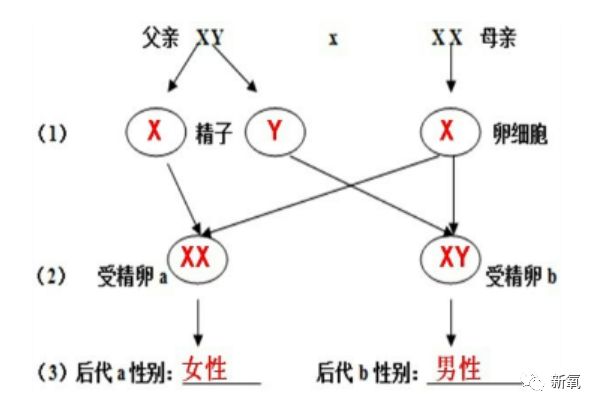 在遗传时,精子和卵子是各带一半的染色体进行结合,然后形成成对的染色体。妈妈不论给男孩还是女孩都是X染色体,而爸爸给女孩X,给男孩Y。