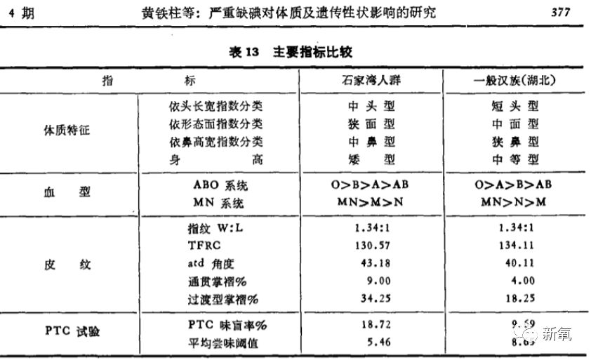 除了这种生活事例,还有实验例子的。缺碘的和不缺碘的人,外观长相就会不同。(下表中的石家湾人为缺碘人群)