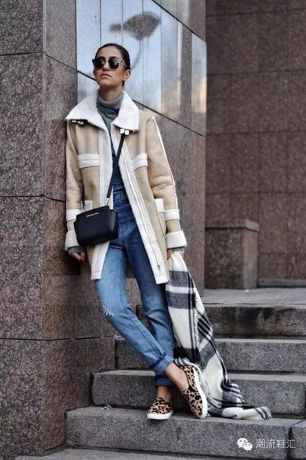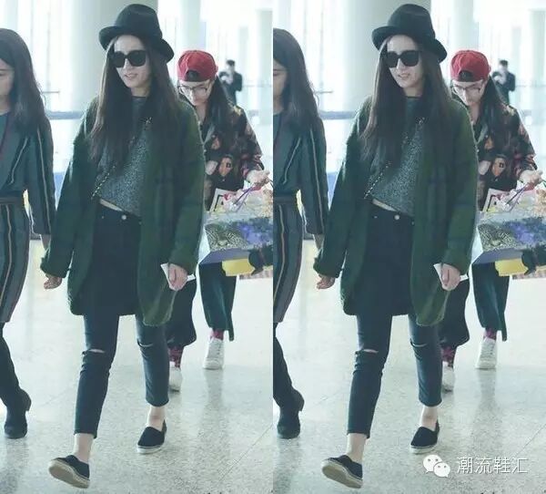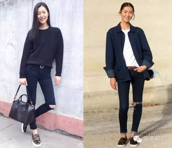 超模何穗也爱穿这上黑色懒人鞋,搭配破洞牛仔裤,休闲范十足,这个时节,上衣搭件黑色毛衣或者是牛仔衬衣都很潮哦。