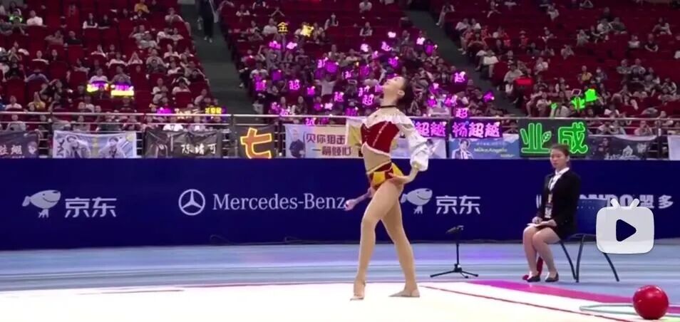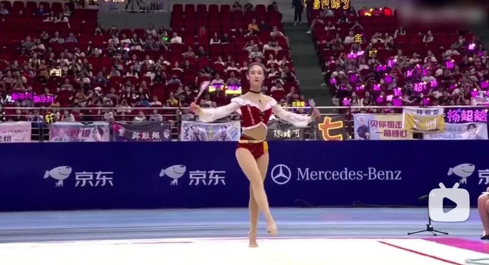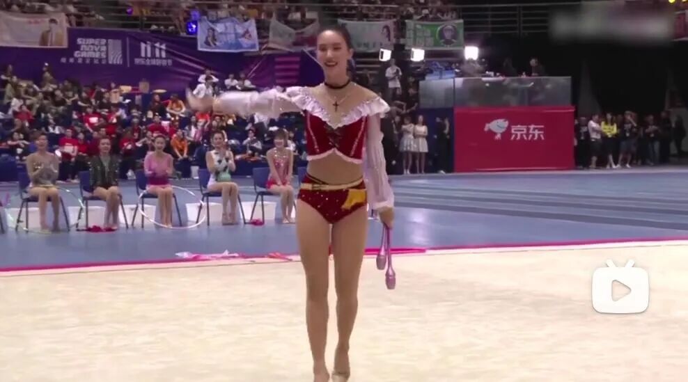 印象很深是2018年,她在《超新星运动会》表演花样体操。要说瑕疵还蛮明显的,发际线过高,腰显长,导致整体比例不算优秀,甩棒时还手滑掉到了地上。