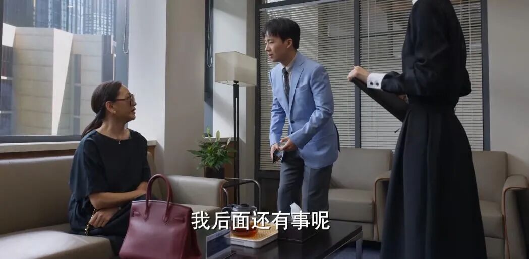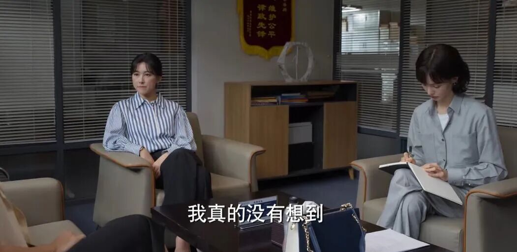 但是追到后面,没错,随着左娜与小伙伴们越来越愉快地工作,投射到穿搭上,她终于开始穿显胖的浅色系套装。比如见一位起诉公司不合理调岗的职员,她穿的这身。