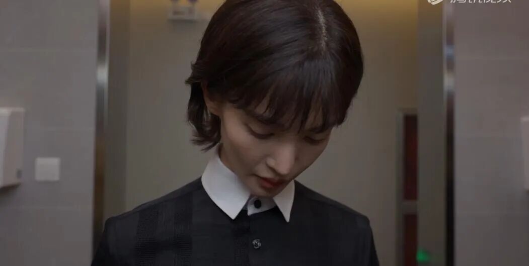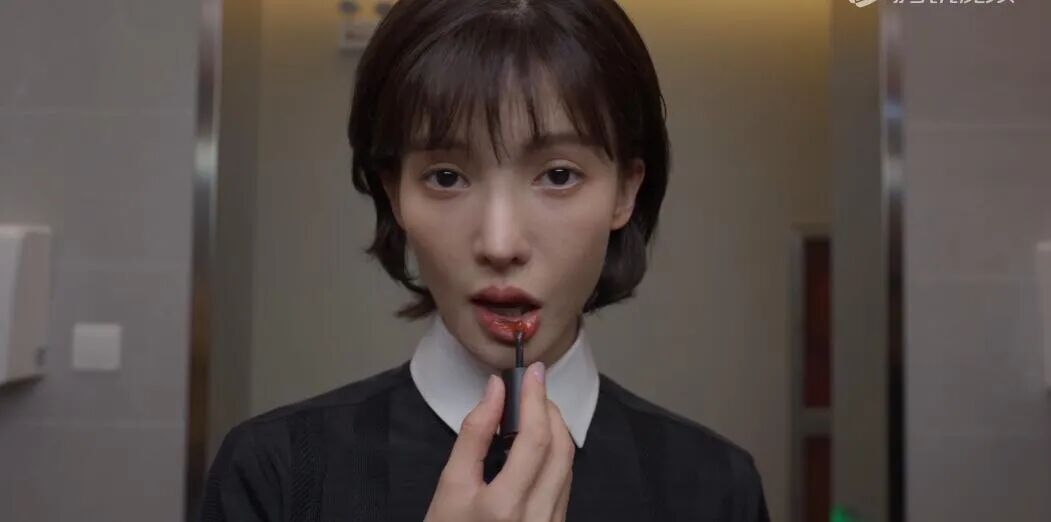 一场是金晨被发火的客户扔包砸了脸,她躲进卫生间补妆。脸冲着镜子也是对着镜头,其实这抹丧又无奈的眼神挺好的,但来不及细品,就被金晨的锥子脸砍掉了情绪。