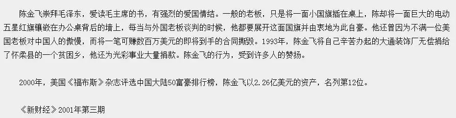 陈金飞,十几年前登上过福布斯排行榜的第12名,他的主要公司叫北京通产投资集团,以房地产、建材为主。可以找到当年财经媒体对他的一些报道。