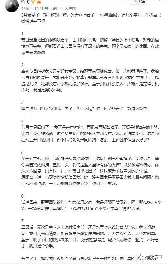 更让许飞不能忍的是,14年不联络,一到节目中就哭哭啼喑,还称好想其他超女,再加上遭到网友指责“情商低”,于是发长文为自己讨还公道。