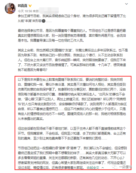 相比之下,韩真真则很直接,发布长文力挺尚雯婕,她认为尚雯婕只是不太懂如何与人相处,怕受到伤害刻意保护自己,而她认为尚雯婕现场泪奔是真情流露,并非作戏,倒是许飞“多事”“抢戏”“蹭热度”,在文中最后,她cue了厉娜的新歌,唐笑的直播,却只字不提许飞。
