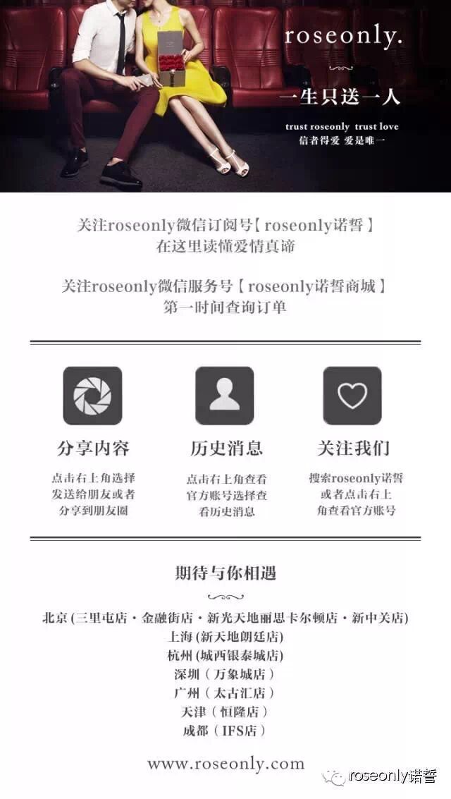 高端玫瑰及珠宝旗舰品牌,斗胆制定“一生只送一人”离奇规则.roseonly以“信者得爱,爱是唯一”为主张,以奢侈玫瑰与璀璨珠宝,打造真爱永恒信物,见证人生中最重要的时刻www.roseonly.com