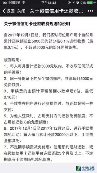 自2017年12月1日起,微信将对每位用户每个自然月累计还款额超出5000元的部分按0.1%收费(最低0.1元),不超过5000元的部分仍免费。腾讯方面表示,这是因为支付的通道手续费成本在迅猛增长。
