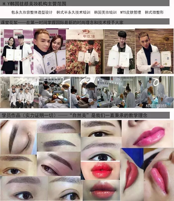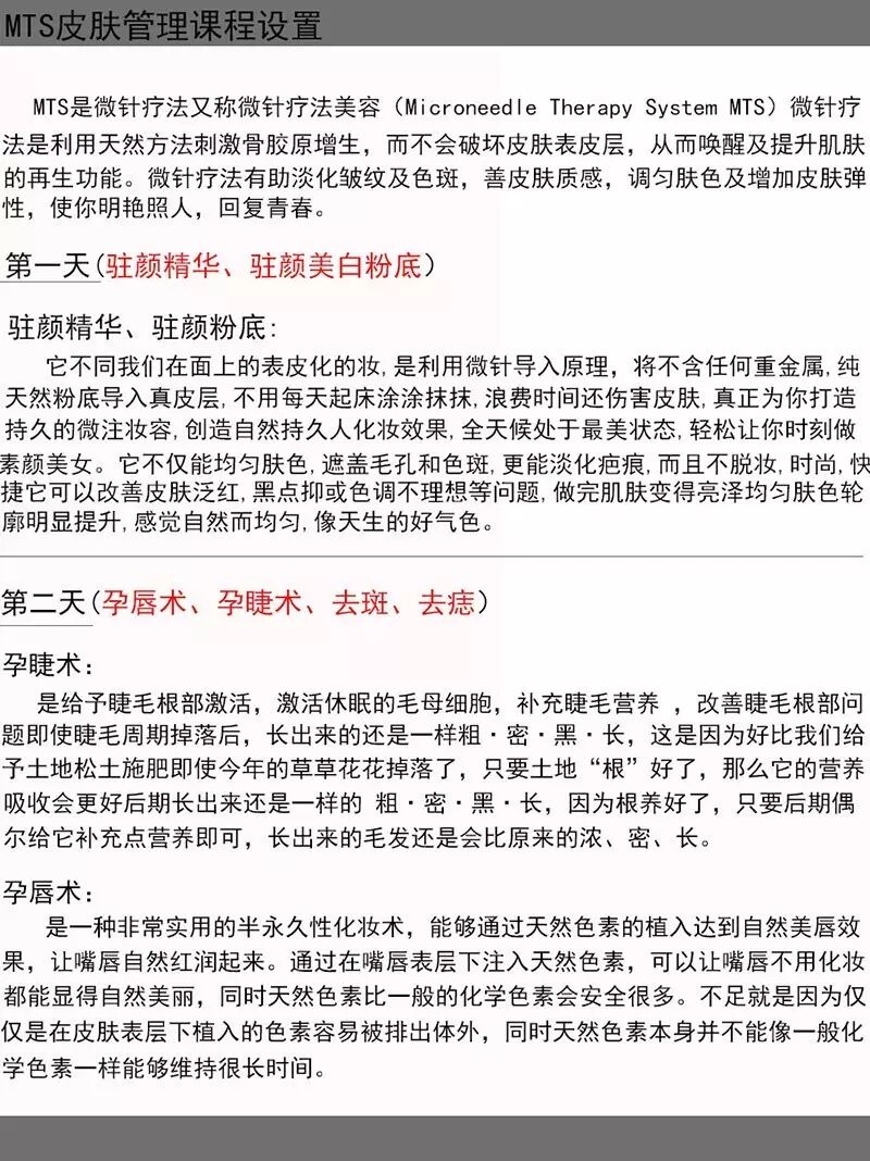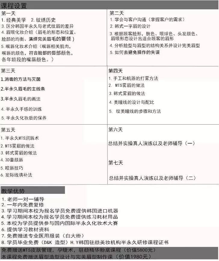课程包括时下最火热的韩式半永久眉眼X发际线、孕睫术、微整、MTS皮肤管理、彩妆。