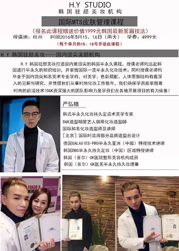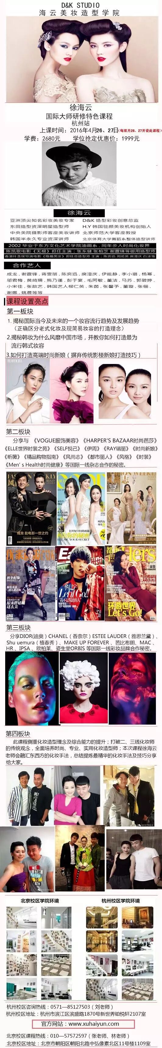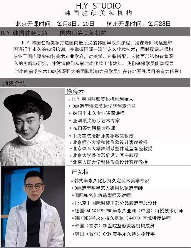 以下是徐老师近期开课课程,有H.Y STUDIO韩国驻颜美妆机构课程、国际大师研修特色课程、针对零基础开课三大板块课程,详细的课程介绍及收费如下: