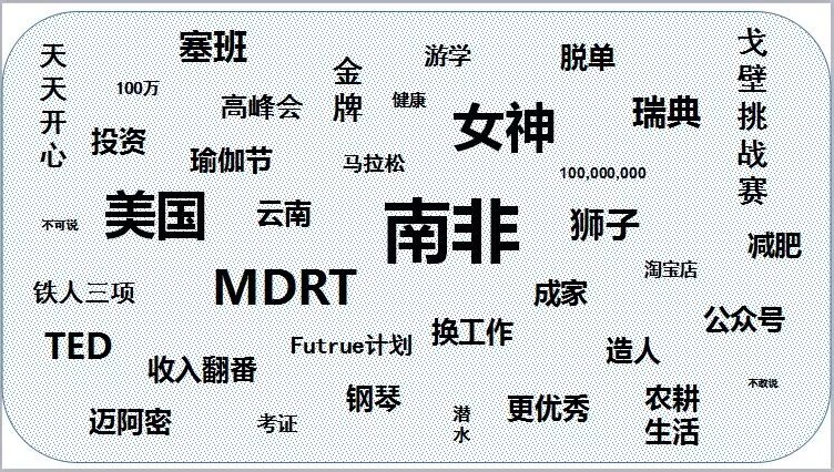 我的微信好友有4664位,我挑选了650位(样本数据),祝福朋友们在2018年有超越梦想的勇气与智慧!然后告诉他们,勤敏君的新年目标是什么——今年6月一定要去南非,带女神一起看狮子(虽然女神还没有追到,囧,能不能追到,南非很关键啊),被狮子追杀……过一个狂野假期!其实这个目标不容易达到,需要非常非常非常努力才可以。梦想还是要有的,万一实现了呢?竭尽全力,有梦必达!^_^