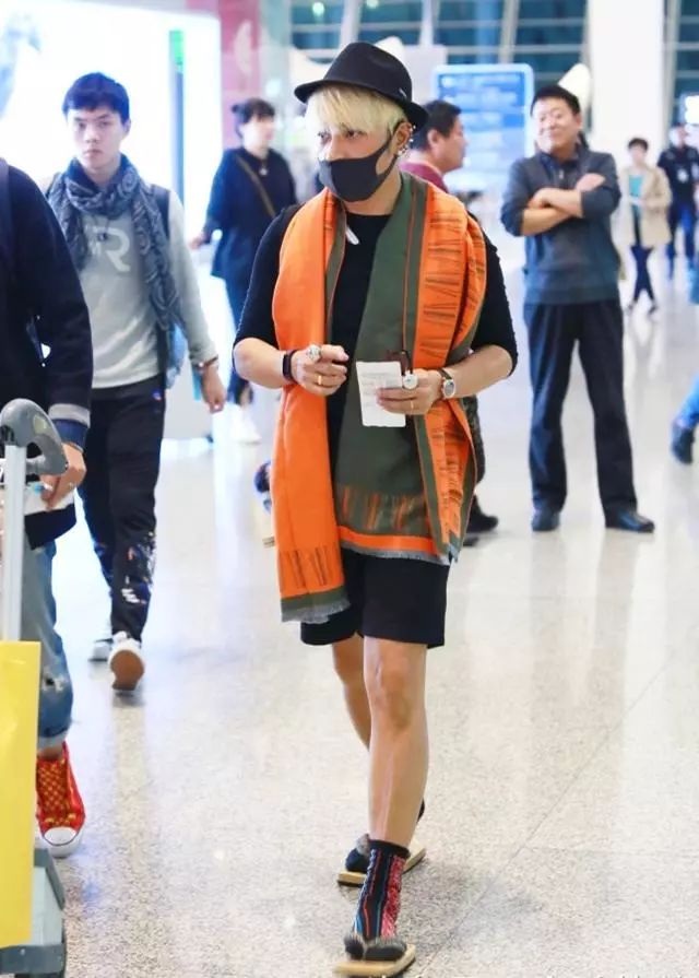 陈志朋是钟爱木屐搭配袜子吗?这次搭配的是花袜子,身穿一件黑色T恤搭配黑色短裤,但是脖子上的橘色围巾实在太抢眼。