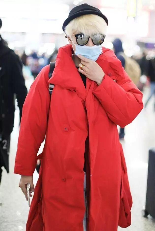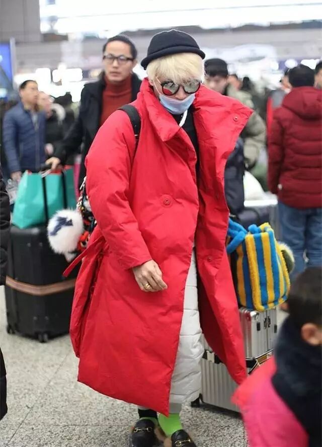 陈志朋黑帽子,黑墨镜,大口罩,全副武装,十分低调,但身穿一件艳红色大袄,搭配白色棉裤,十分亮眼,真不知道是想低调呢还是高调呢!真是尴尬。
