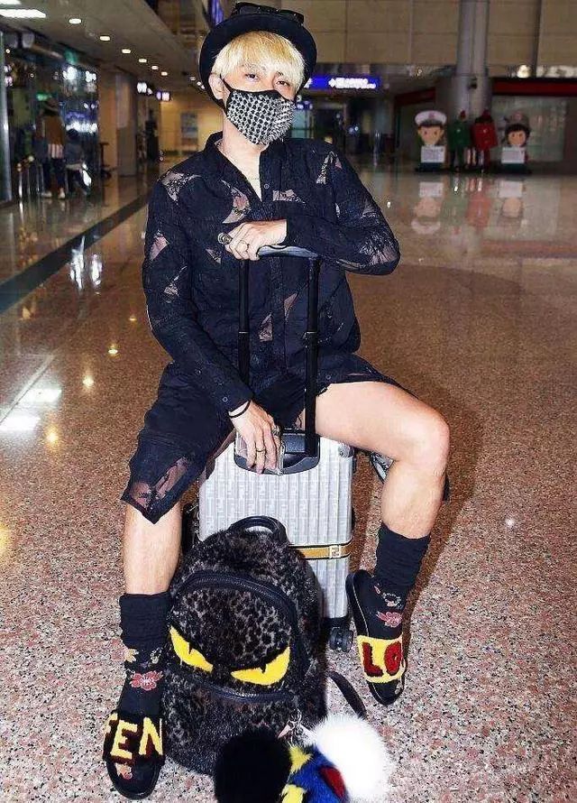 陈志朋身穿一件黑色衬衣,下搭一条黑色热裤,脚上一双字母凉拖,搭配黑色绣花长筒袜,实在胆大新奇,满是铆钉小刺刺的口罩看上去好吓人。