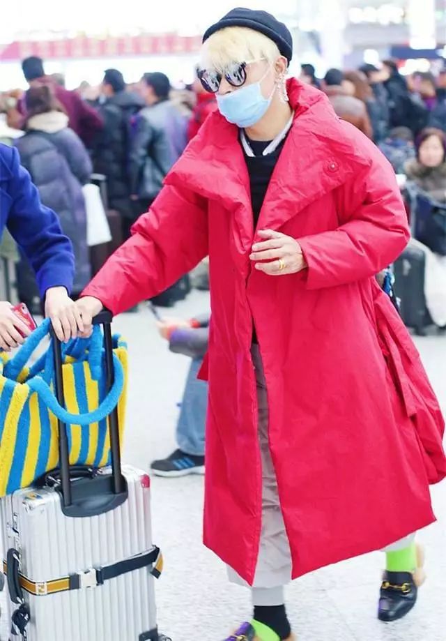 陈志朋现身某机场,一条白发十分抢眼,身穿一件红色超长外套,加上一双绿色袜子,这颜色搭配真是腻害了!手中的蓝色条纹大包也是十分抢眼呢。
