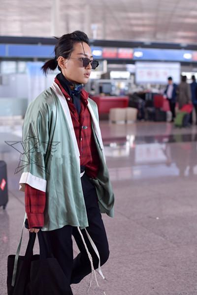 绿色的外套类似睡衣一样宽松的披在身上,衣服的衣领和开衫的一圈均为白色,有几分和风的感觉,将随性演绎到极致,这样洒脱的笔笔很个性。