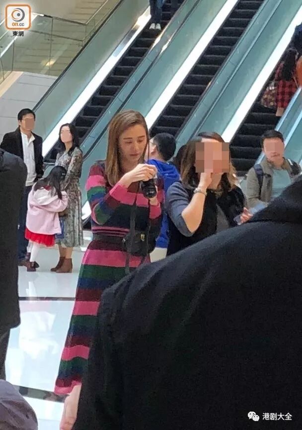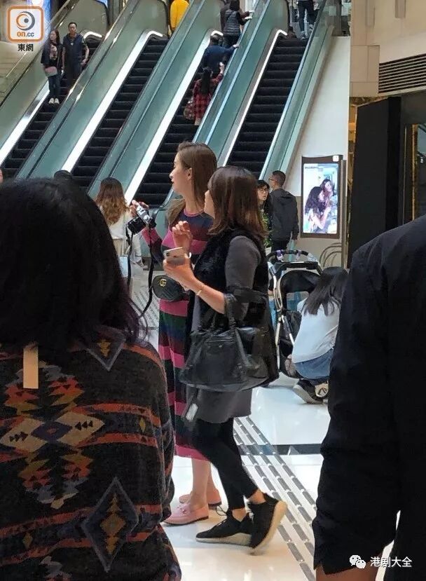 同场见沈卓盈与女友人闲逛,穿上彩色间条连身裙的她更龙友上身,攞住相机四出影圣诞树。