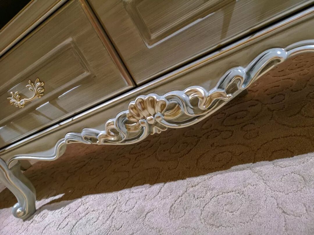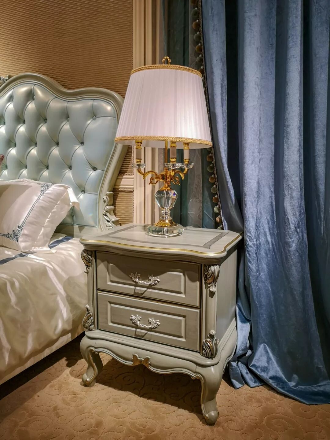 床头柜上的莨苕叶与玫瑰雕饰,有着美丽的锯齿形叶子与优雅的姿态,寓意再生与复活,被金富丽的艺术家与匠人们应用于家具艺术之中。