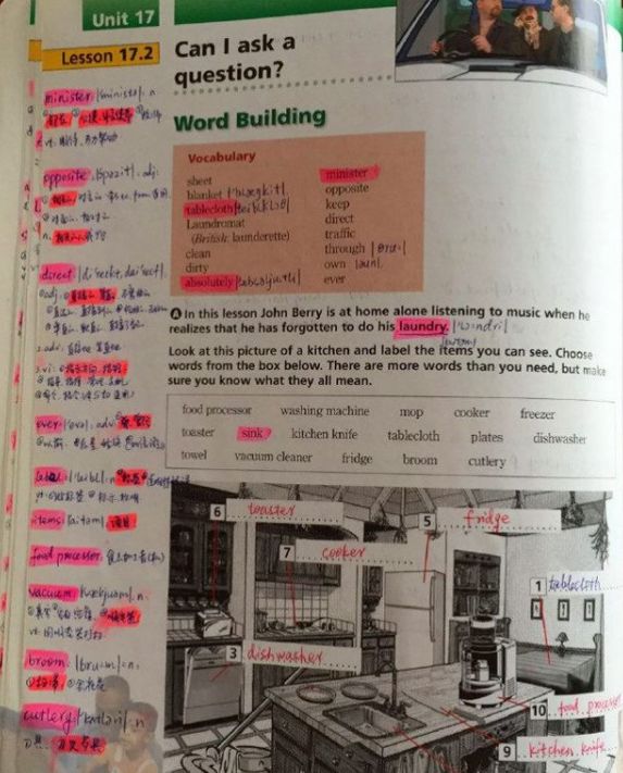 她请了贴身英语私教见缝插针1对1补习,重新开始啃语法、背单词,狠下了一番苦功。看看她当时的英语课本,密密麻麻做满了笔记、划满了重点。