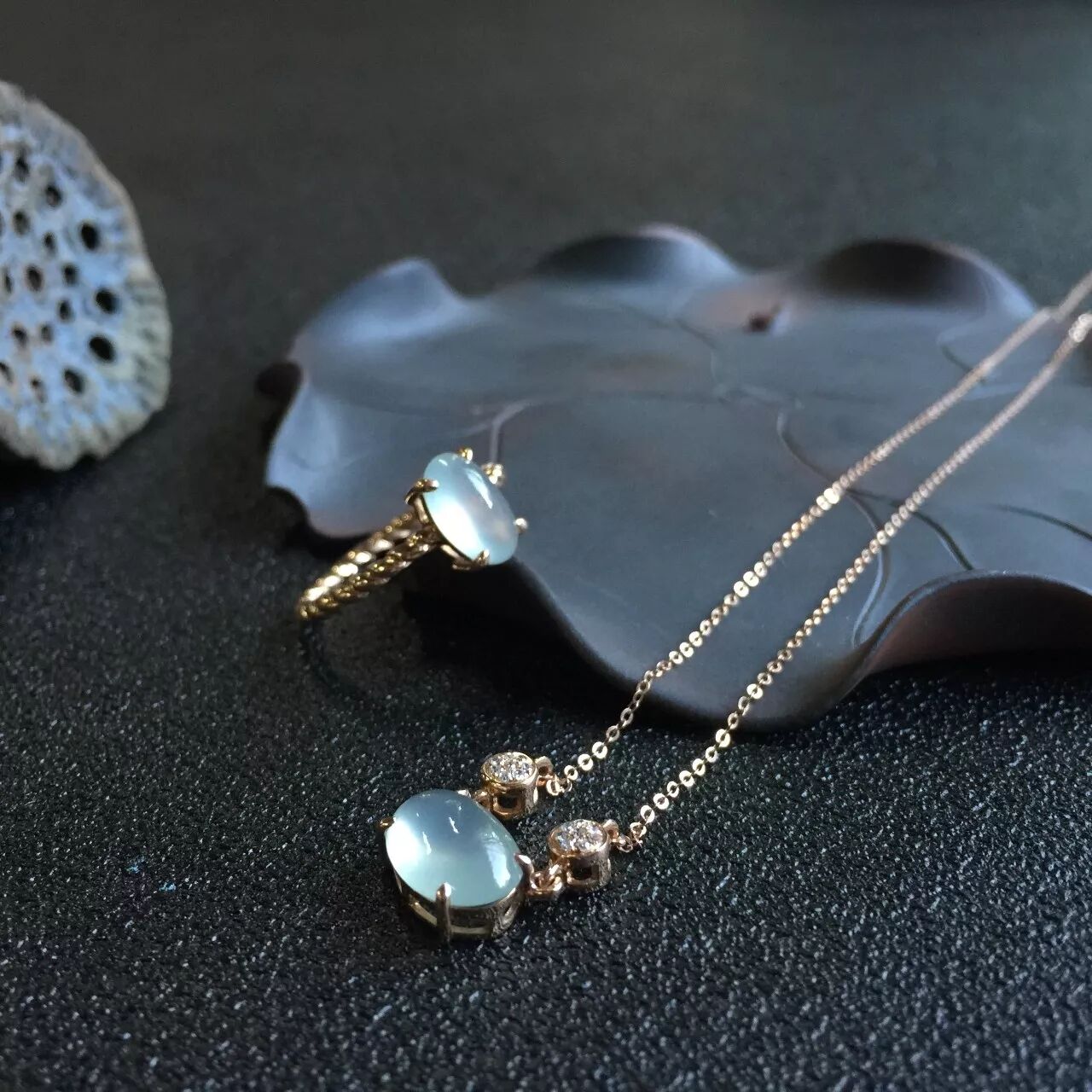白冰套件,质地细腻温润,镶嵌精致,轻盈小巧,锁骨链和戒指都有啦,上身佩戴清爽。