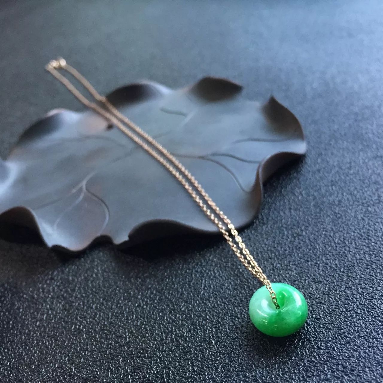 带色平安扣项链,糯种质地,通体圆滑,颜色嫩绿,小巧厚实,配18K金链,上身效果非常不错。