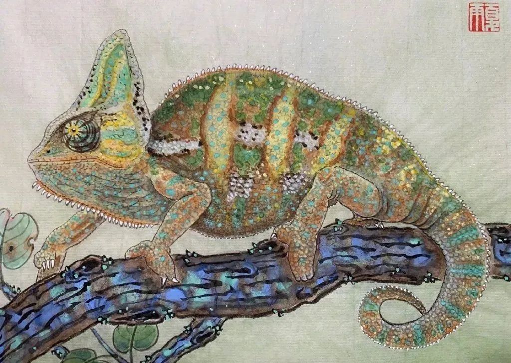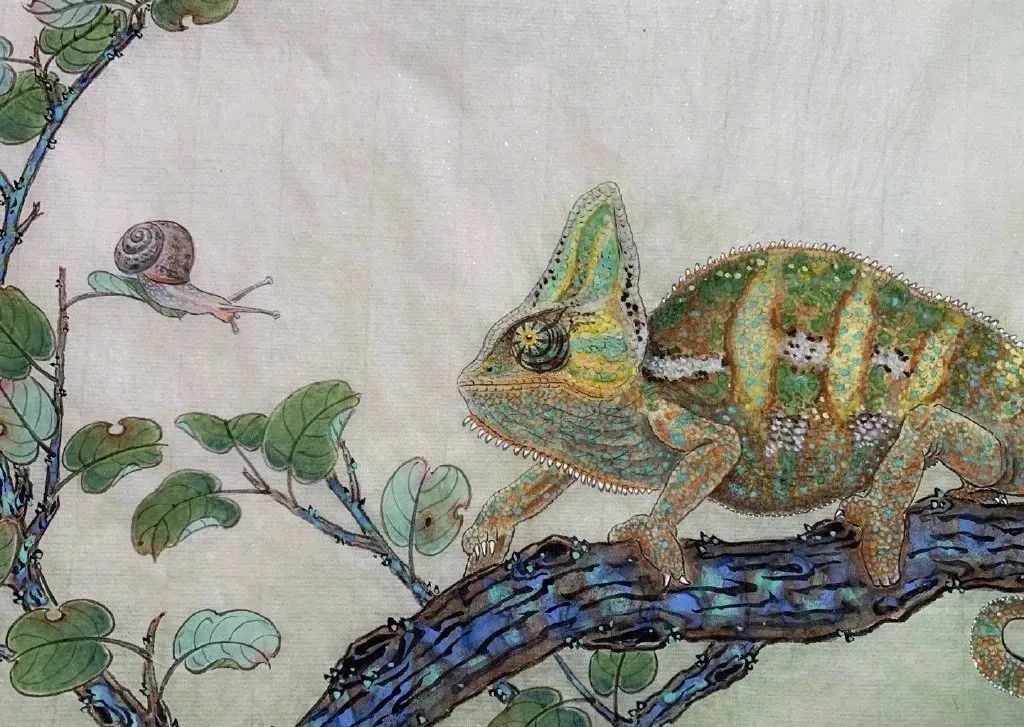 全方位掌握了这些专业的技法 这是他画的蜥蜴和蜗牛 画中,一只蜥蜴朝向蜗牛飞奔 即将迎来一顿美味的晚餐