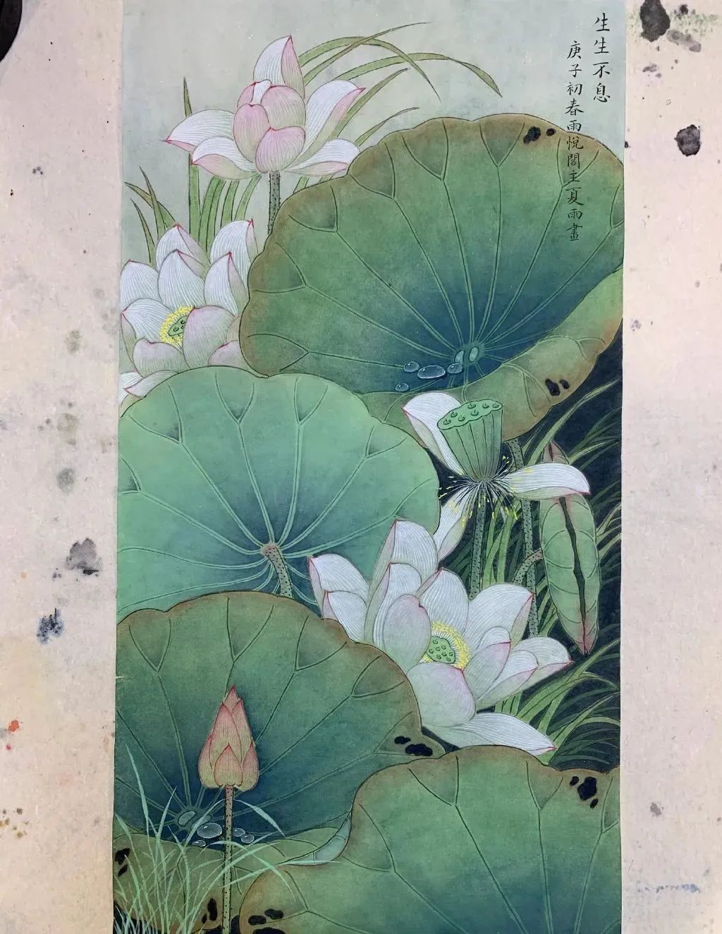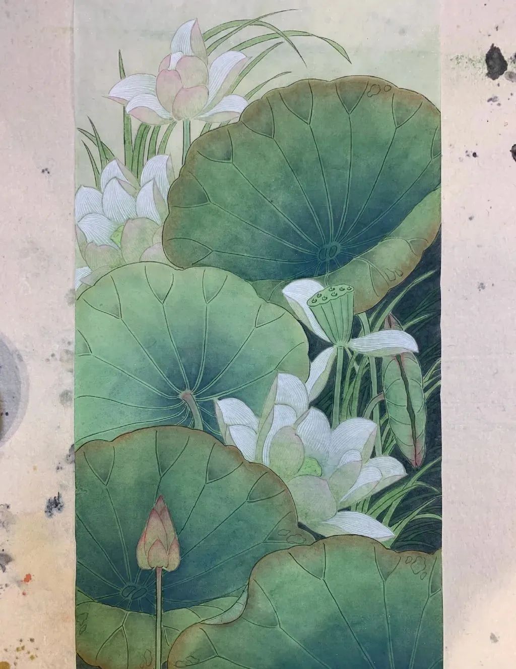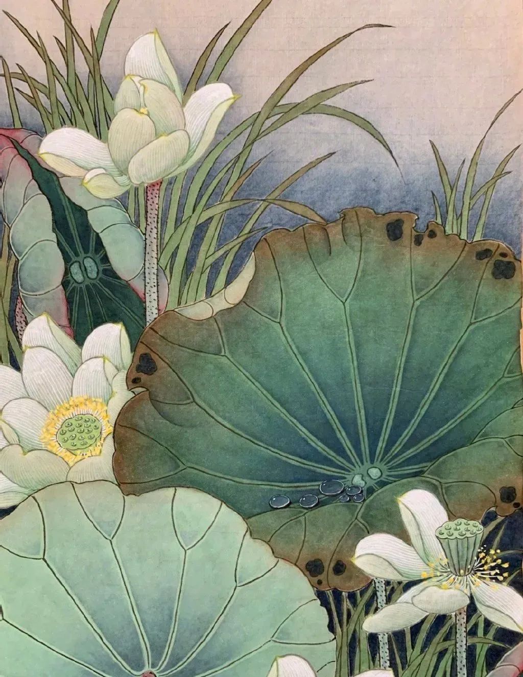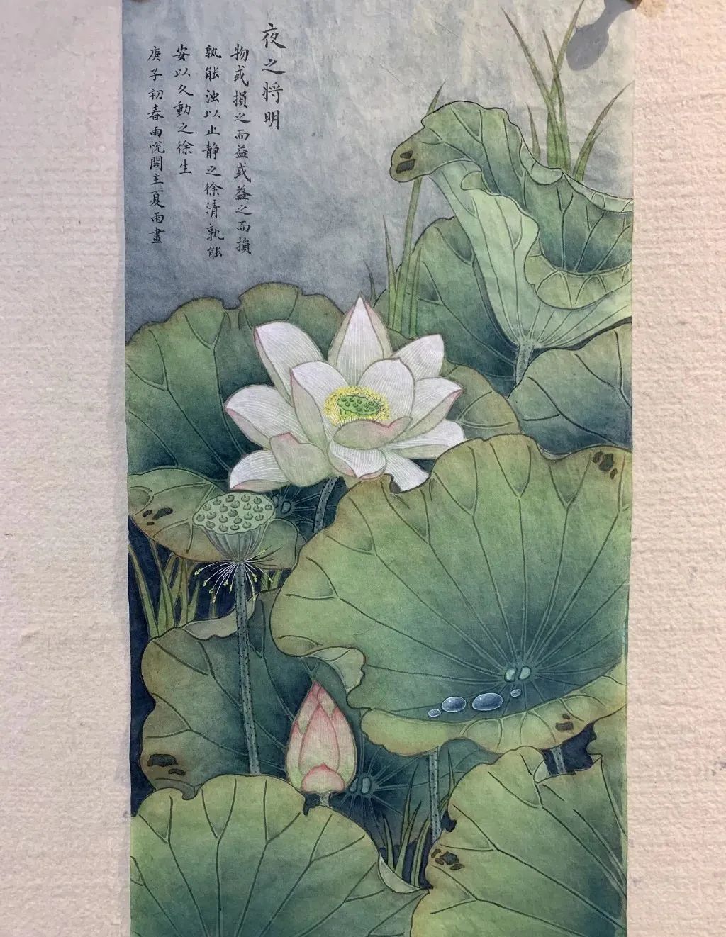 天啊 这也太美了吧 夏雨画的工笔意境深远 笔法苍劲、设色明暗有序 荷花花冠硕大,如碗似盆,质厚玉润 粉荷清丽动人,白荷高雅圣洁
