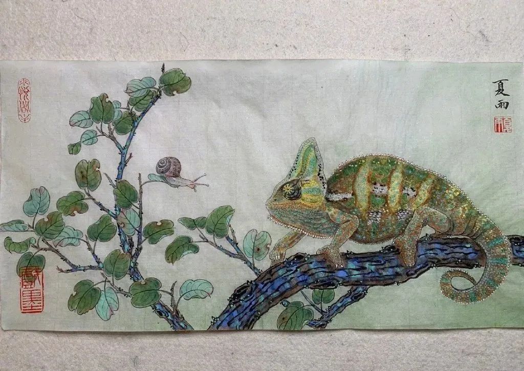 非科班出身的夏雨 全方位掌握了这些专业的技法 这是他画的蜥蜴和蜗牛 画中,一只蜥蜴朝向蜗牛飞奔 即将迎来一顿美味的晚餐