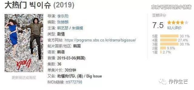 《大热门》在豆瓣的评分还是不错,达到7.5分,豆瓣网友的评论是开头充满悬念,镜头调度很棒,男女主作为同行经历了大事件后两人的地位发生反转。同为记者秉着不同理念和行为去挖掘真相并疗愈自己,某种程度上很吸引人。以及如果保持开头的电影感,后面说不定会好看。顺便韩艺瑟脸也整坏了,哭的表情像笑,还被弹幕质疑演技。