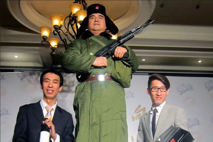 头戴雷锋帽、身穿军大衣、手握钢枪,一身标准“雷锋”装扮亮相电视台节目录制现场。