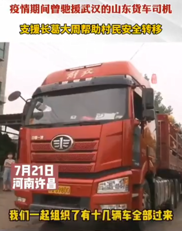 山东临沂,曾在疫情期间支援武汉的货车司机,如今又开着大货车,去河南帮助被困村民安全转移。