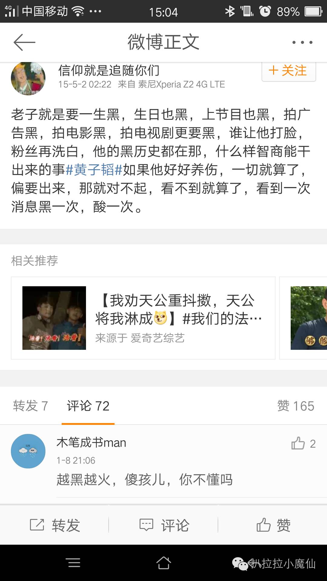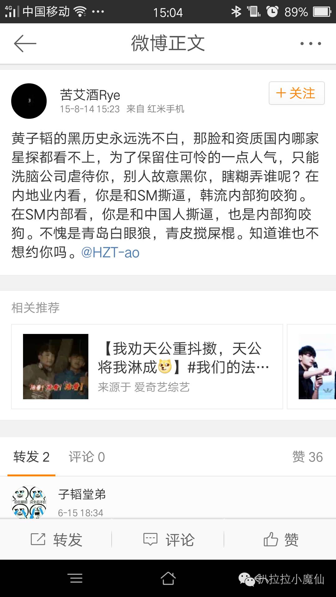 男团exo,黄子韬曾因撰文骂其叛徒,而受到网友攻击。随后,黄子韬"耍大牌"、在台上粗暴地推搡队友、在度假中对尾随者亮出棍棒、点赞黑吴亦凡的消息等旧事也被一一扒出,另他的形象陷入低谷,在随后的一些采访中,黄子韬透露了很多信息,也对吴亦凡表达了歉意,但网友根本不买账,甚至发起了话题:“做人不能太黄子韬”、“逼着吴亦凡原谅他”等,在那个时期,吴亦凡受到了广大网友力挺,演艺事业、唱歌事业也蒸蒸日上,相反,黄子韬就被网友黑得体无完肤,回国后的娱乐事业发展,和吴亦凡就不在一个档次上。