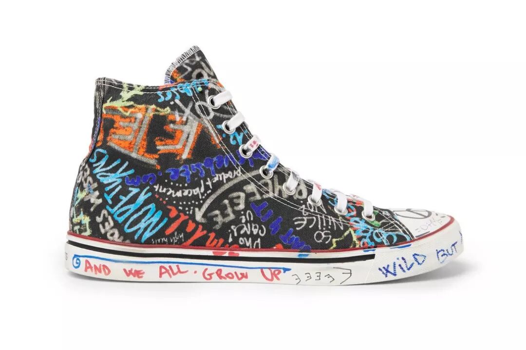由 Demna Gvasalia 主理的 Vetements 热潮虽然稍微降温,但在数据平台 Lyst 早前发布的最热门品牌排行榜中,Vetements 依然占据著第六名的位置。Vetements 2018 春夏新品陆续上架,除了全新的 Reebok Sock 跑鞋之外,这次品牌就带来了自家出品的帆布鞋款,以 Converse All Star 作基调的简将线条,却布满了由 Demna Gvasalia 所设计绘制的「artful scribbles」涂鸦,内容除了关于爱与和平之外,亦有来自 1970 年代乐队 Funkadelic 的《Free your mind》专辑的元素。有兴趣的朋友目前已可在 MR PORTER 网站购买得到。