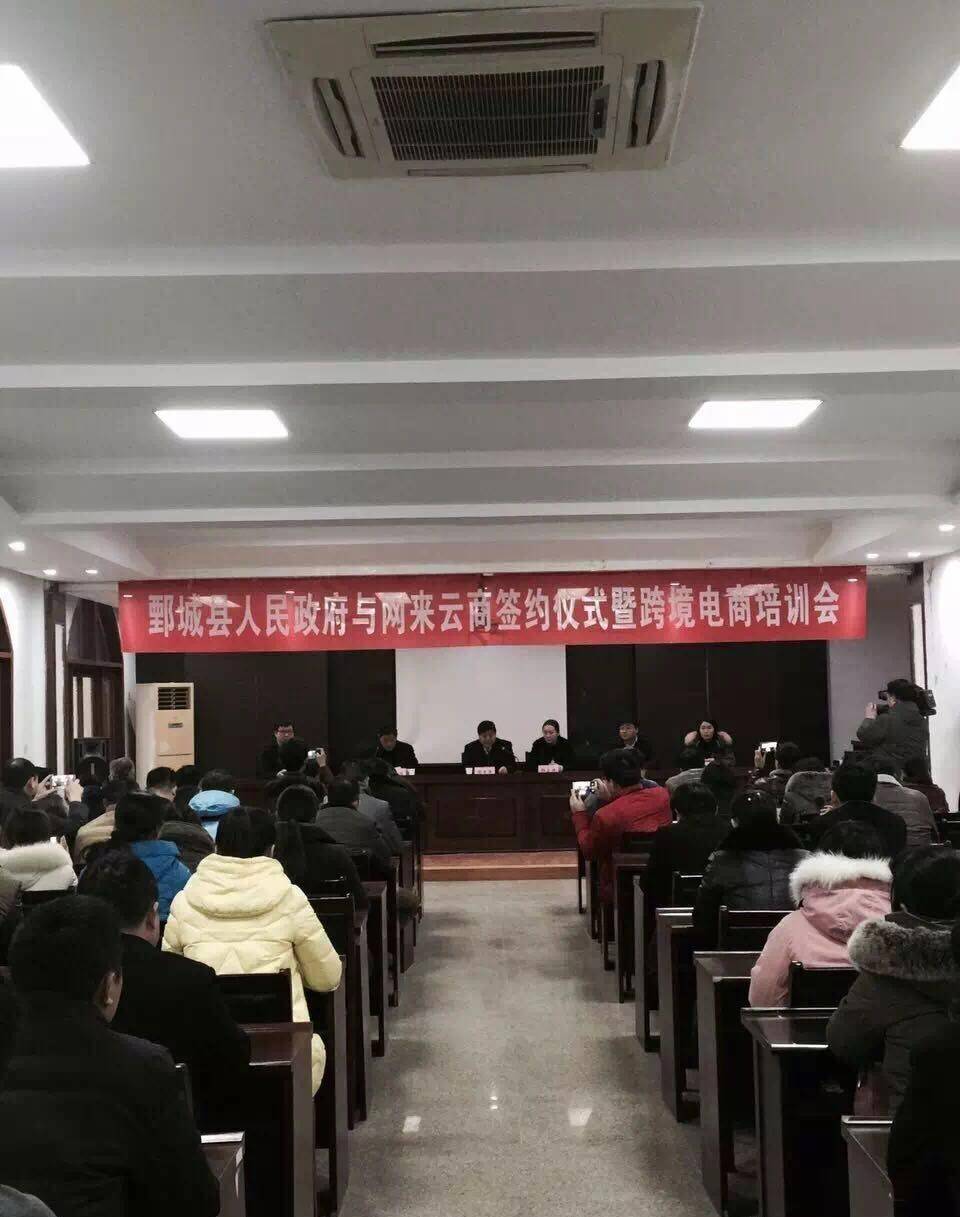 2月21日上午,鄄城县人民政府与网来云商合作签约仪式与跨境电商培训会在伯灵云谷电商产业园跨境馆路演大厅召开。