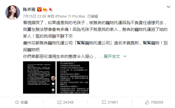 记得上个月,陈乔恩为闹得沸沸扬扬的宠物托运发声,严厉指责那些没有良心,唯利是图的商人。