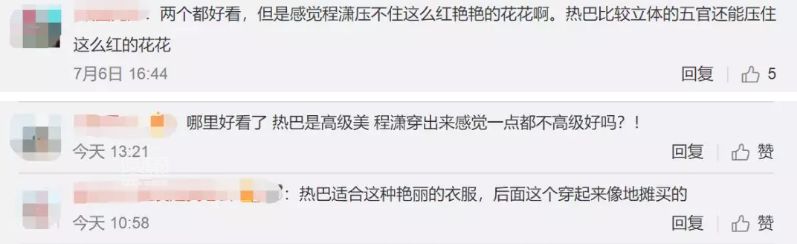 评论区里网友的评价还是比较一致的,很多人都认为热巴更适合穿这条裙子,觉得热巴穿起来是高级美,又贵又仙气,而程潇穿起来像地摊买的。