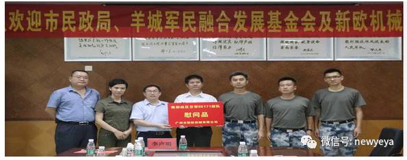 中国网 8月5日讯 (李纪闻 通讯员 帅才英)2017年8月1日,在举国上下庆祝中国人民解放军建军90周年的喜庆日子,广州市新欧机械有限公司总经理王起新随广州市民政局、广州市羊城军民融合发展基金会领导一道,走进驻穗95171部队进行慰问,表达对人民解放军的深情厚意。广州市羊城军民融合发展基金会理事长龙国祥、秘书长帅才英、宣传新闻处处长李圣杰、副秘书长丘小军等领导以及新欧机械有限公司财务总监谢若冰、副总经理曹超忠、行政助理李声明参加了慰问。95171部队部队长宋成海、政委滕德君热情接待了慰问团一行,召开了座谈会,畅叙军鱼水深情。部队副部队长孙兴华、副政委谭兆睿、参谋长王雷、政工处主任王大伟一同参加了座谈。