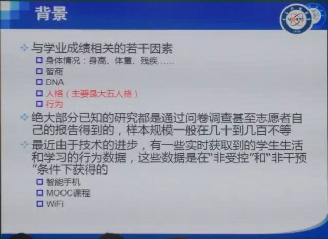 对学业有较大影响的因素有很多,例如身体状况、智商、DNA、人格、行为等。我们主要关注人格和行为,因为它们是可以干预和调整的。以前我们对这些问题的研究只能是通过调查问卷的形式获得几十、几百的样本。现在由于技术进步,我们能够获得海量的数据,例如通过智能手机、mooc或者wifi等。